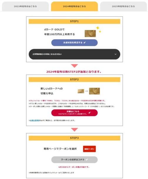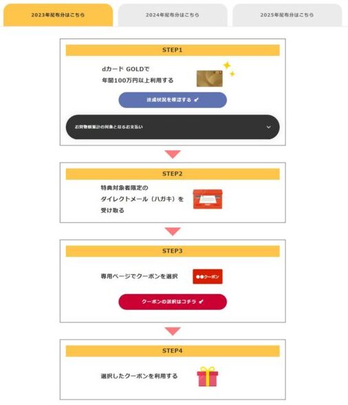 dカードサイトの「特典進呈までのSTEP」を見ると、2023年配布分(2022年利用分)、2024年配布分(2023年利用分)、2025年配布分(2024年利用分)と、3つに区分されていました。
