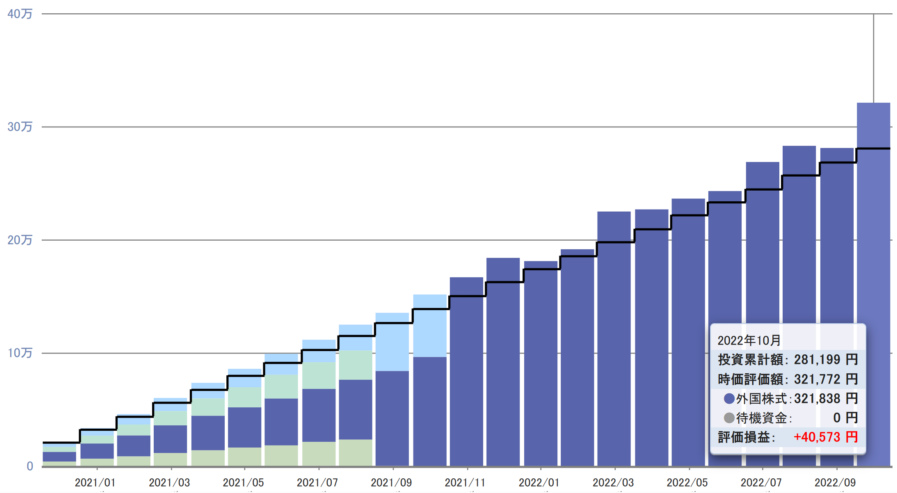 iDeCo開始から1年10か月後の2022年10月時点の評価損益はプラス40,573円でした。