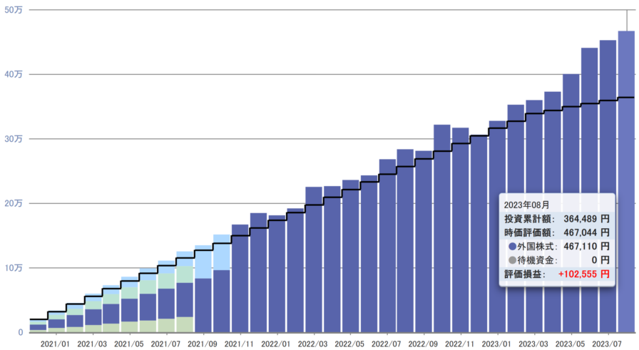 iDeCo開始から2年8か月後の2023年8月時点の評価損益はプラス102,555円でした。