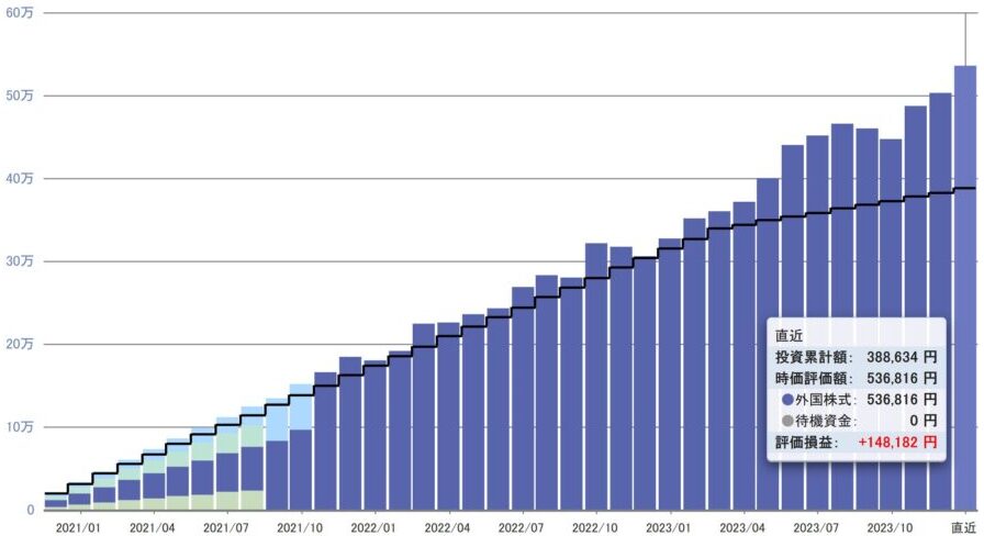 2024年1月末には運用商品を楽天VTIから楽天オルカンにスイッチングしますが、このまま世界経済の右肩上がりが続いて欲しいと思います。