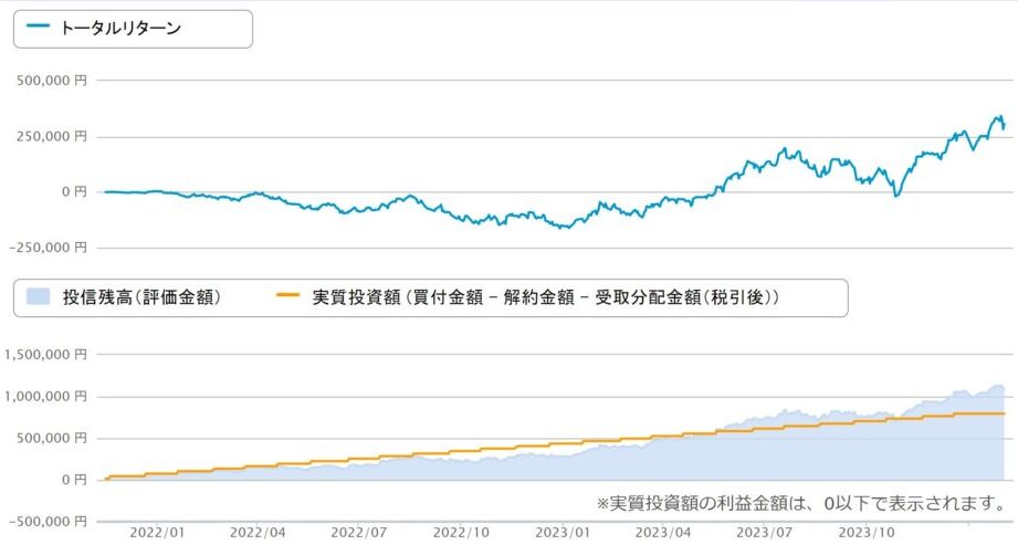 レバナス積立投資を始めてから2年4ヶ月が経過した2024年2月時点の運用成績は以下のとおりです。