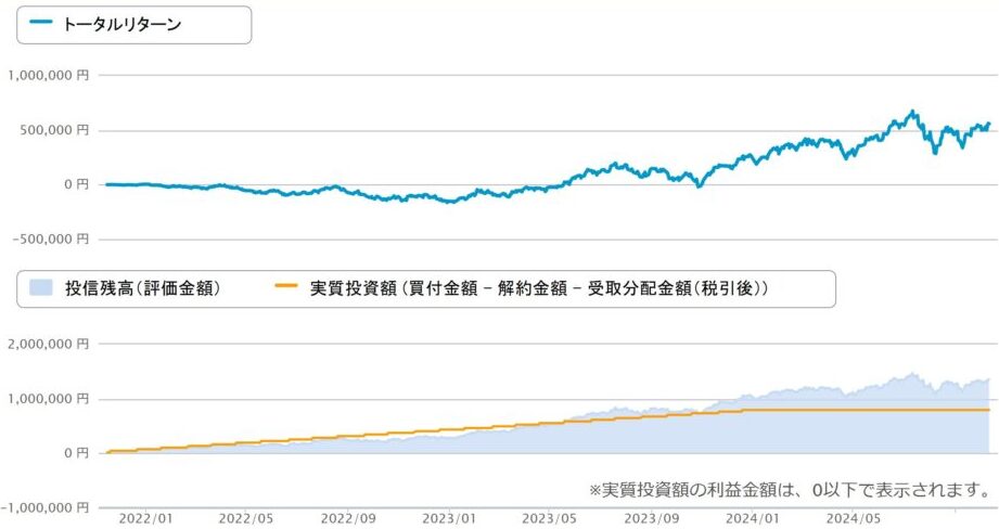 レバナス積立投資を始めてから3年が経過した2024年10月時点の運用成績は以下のとおりです。