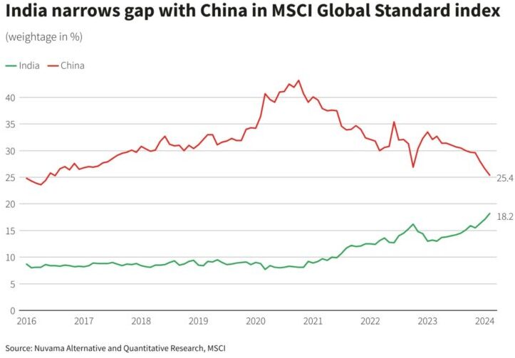前回の2024年5月の銘柄入替でも、中国株が10増56減、インド株が13増3減だったので、最近は中国減少&インド増加の傾向が続いています。