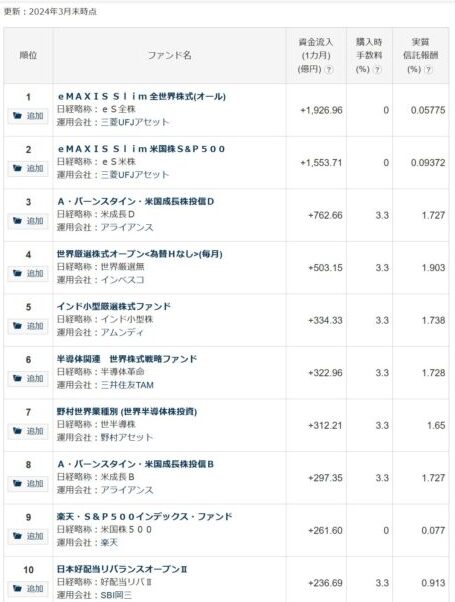 eMAXIS Slim 全世界株式(オール・カントリー):投資信託への資金流入ランキングでトップ