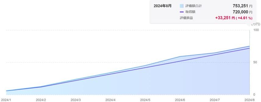 新NISAつみたて投信枠での投資を始めてから8ヶ月が経過した2024年8月時点の運用成績は以下のとおりです。