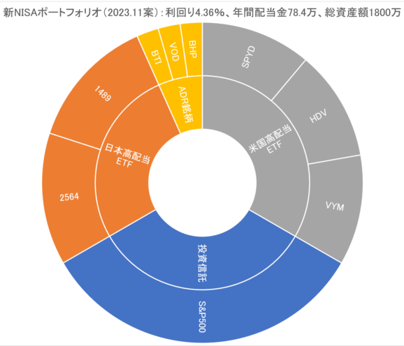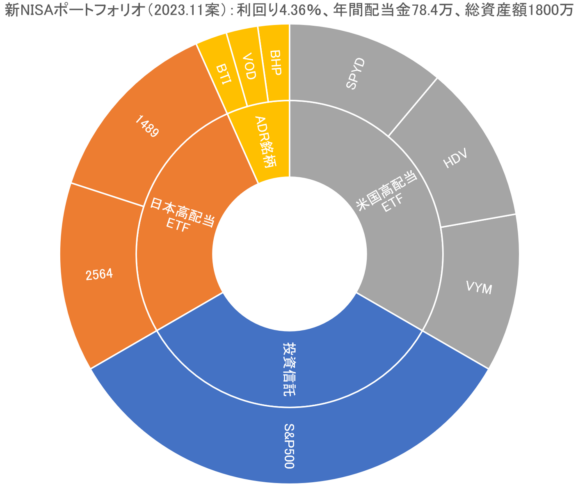 一方、ポートフォリオに組み入れる予定であった超高配当ETFのJEPI、XYLDなどが新NISAの対象銘柄から除外されましたので、個別株(ADR銘柄)の保有比率を高めることで対応します。